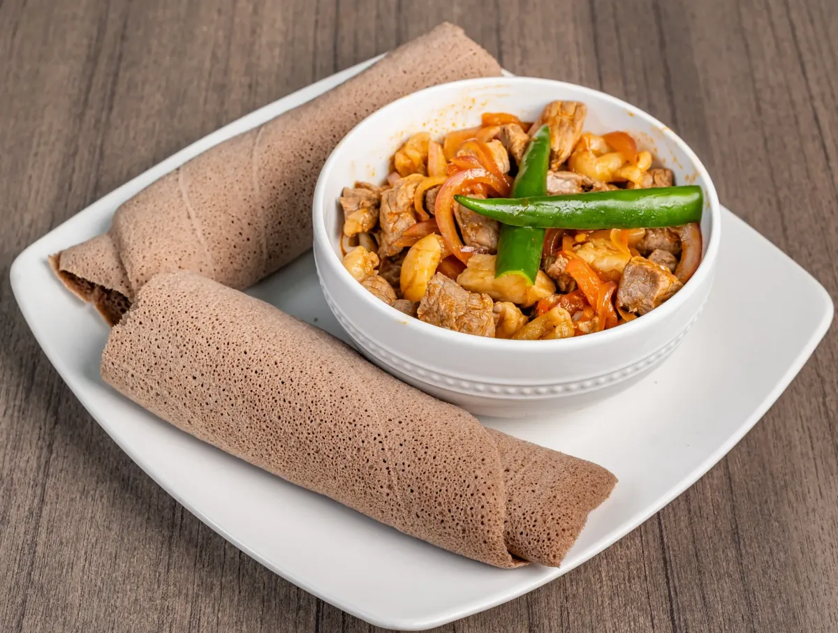 A smooth and flavorful chickpea stew, simmered with onions, garlic, and berbere, served with injera